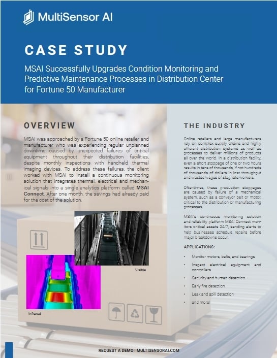 This case study shows how a Fortune 50 online retailer used MultiSensor AI to eliminate recurring unplanned downtime across its distribution facilities. Despite regular handheld inspections, critical conveyors and motors continued to fail. By deploying continuous thermal monitoring with the MSAI Connect platform, the retailer detected overheating belts, misaligned conveyors, and failing motors before breakdowns occurred. The result was immediate cost avoidance across multiple assets, a positive ROI in approximately one month, and a scalable predictive maintenance model now rolling out across global facilities. A clear example of how 24/7 condition monitoring outperforms manual inspections in high-throughput distribution operations.